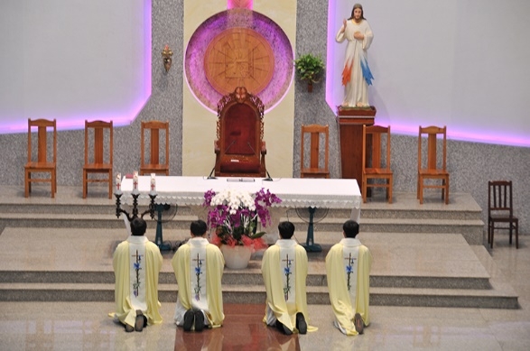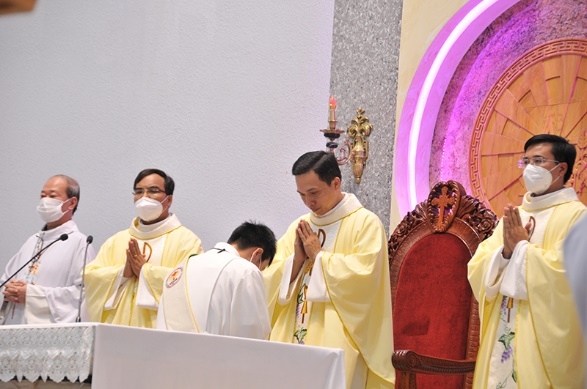 Sau lời nguyện hiệp lễ, 04 Tân linh mục bước ra quỳ giữa gian cung thánh trước lời cầu xin tha thiết của cộng đoàn dân Chúa trong kinh “cầu cho Tân linh mục”. Lời cầu nguyện xin cho các Tân linh mục được noi gương Thầy Giêsu, vị Mục Tử cao cả. Xin Chúa luôn giữ gìn và nâng đỡ để Tân linh mục Phao-lô luôn xứng đáng với hồng ân được lãnh nhận và trung thành với những gì mà mình đã tuyên hứa.
