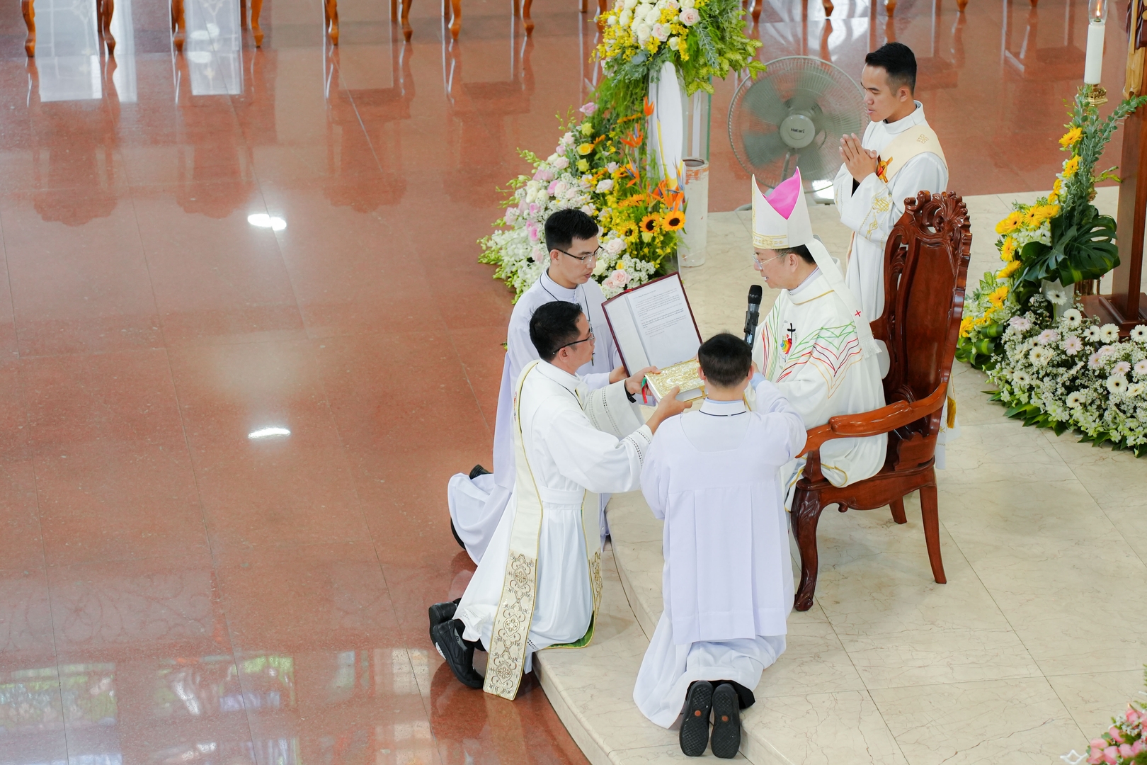 Sau phần Phụng vụ Lời Chúa, Đức cha Giuse Nguyễn Tấn Tước đã long trọng cử hành nghi thức truyền chức, qua việc đặt tay và đọc lời nguyện thánh hiến trên các tiến chức. Khoảnh khắc ấy, toàn thể cộng đoàn cùng hiệp thông trong thinh lặng và lời cầu nguyện, xin Chúa Thánh Thần tuôn đổ muôn ơn trên các tân chức.