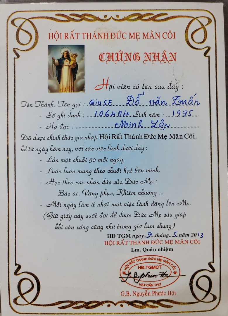 Tôi còn nhớ như in năm 2013, khi vẫn còn là một cậu lễ sinh của giáo xứ, tôi được một Soeur thuộc Dòng Mến Thánh Giá Chợ Quán giới thiệu, mở ra một hành trình gắn bó đầy ý nghĩa với Đức Mẹ Maria và Hội Rất Thánh Đức Mẹ Mân Côi. Hành trình mà đến hôm nay, mỗi khi tiếng kinh vang lên lại khiến lòng tôi dâng trào bao kỷ niệm và niềm tin sâu sắc.